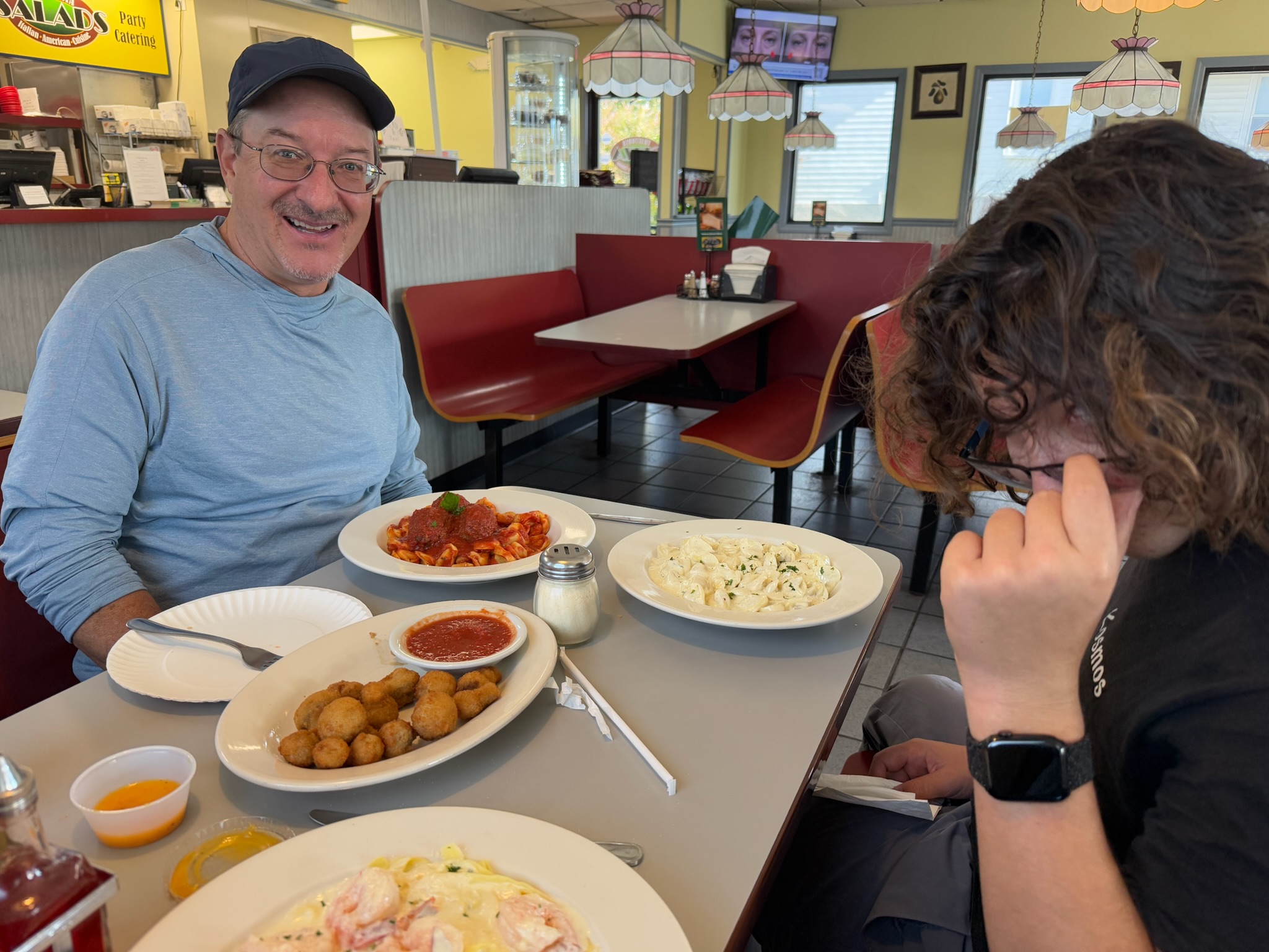 We came to an adorable, historic looking small town. We were getting hungry. Eric was craving Pizza, so we consulted Maps and saw there was a pizza restaurant a short ways off our path that was currently open. We turned onto a main road called King’s Street. Trattoria Pizza was in a low, modern building just outside the historic area. Per the menu, we were in Littletown, Pennsylvania. The food was fantastic, the portions were big, and the prices were good. We rate this place excellent value for the money.