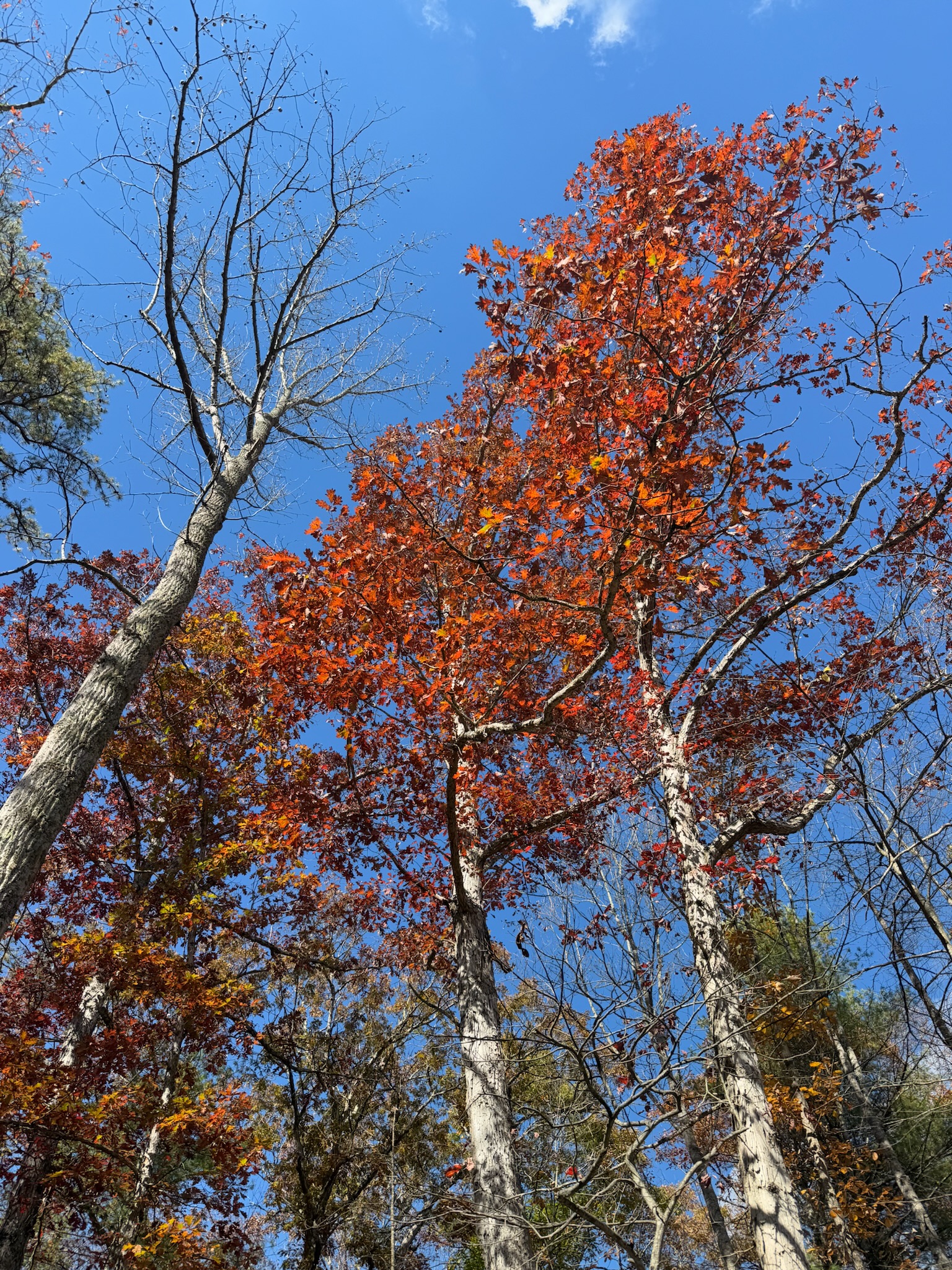 We did a loop through the hills that took about an hour. We noticed that on many of the trees, the leaves at the top had become colorful, but were still green lower down.