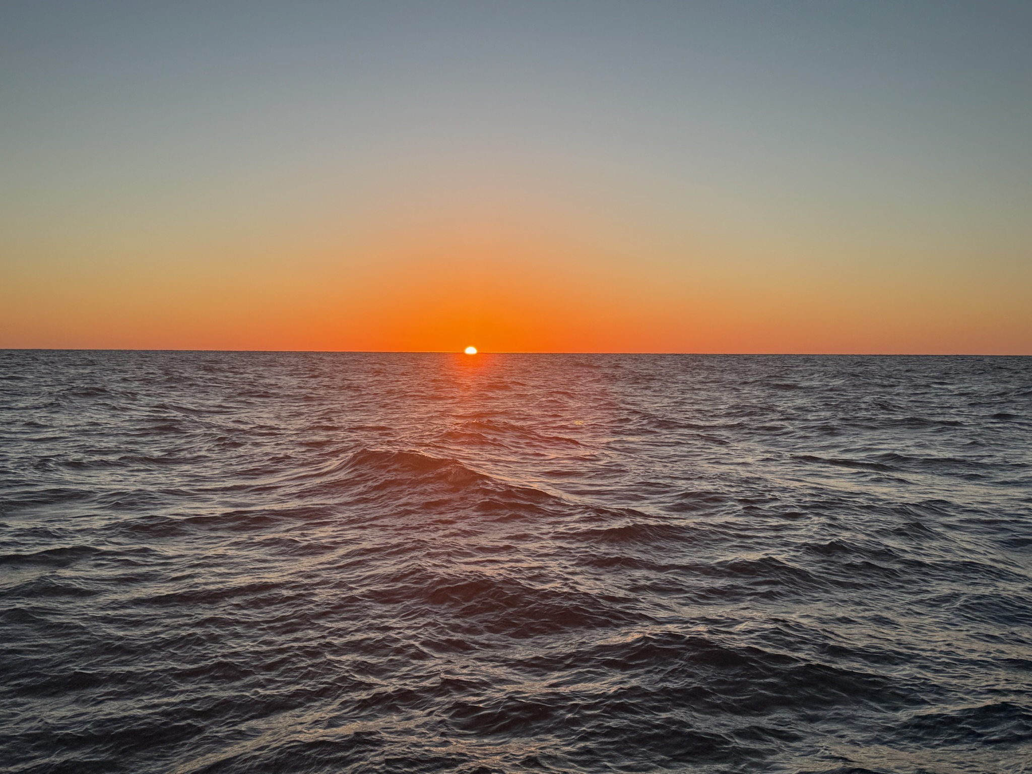 Friday November 14 — By midnight, we were nearly across the Gulf Stream. Eric was able to put the autopilot back onto auto navigation mode. Our speeds improved, and Eric moved the RPM down to 1600, where we were averaging about 6-knots. The winds had calmed down and were now coming from the aft, so the ride improved. Keith’s seasickness subsided, and he didn’t seem to be catching Christi’s cold. Eric was still fighting the cold. Christi’s cold had turned into a sinus infection. It was a dark night. The moon didn’t rise until 0200, and when it did, it was only a crescent, so it only helped a little with illumination. Here was dawn: