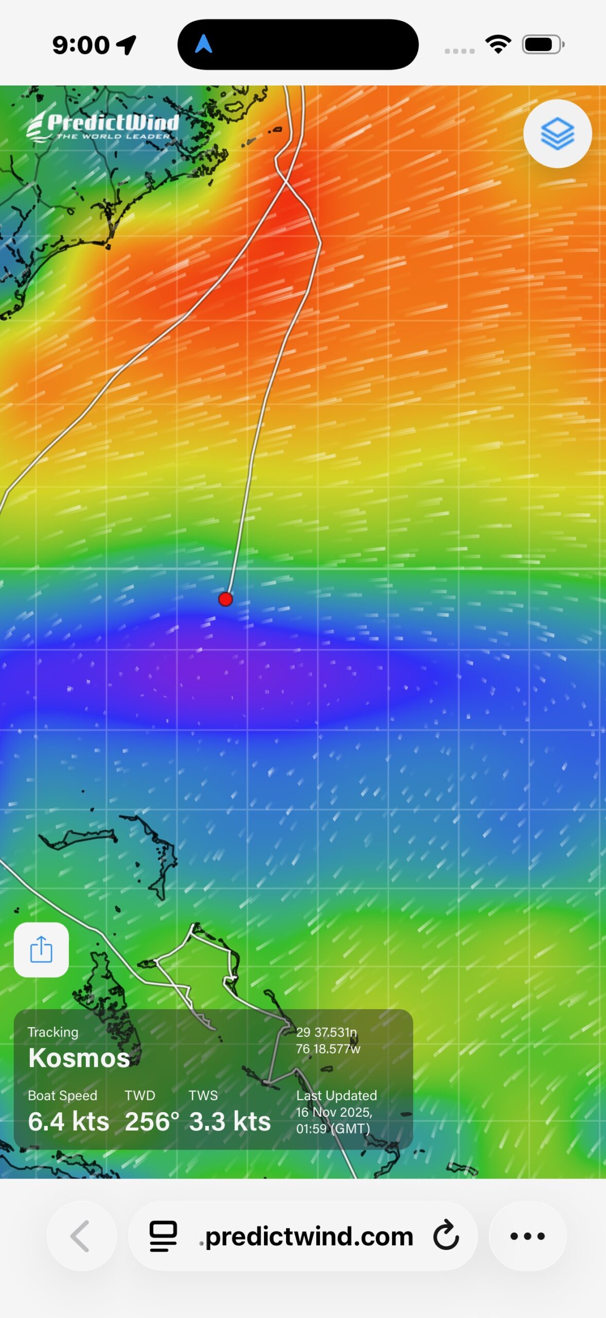 Here was what the sea conditions looked like on Saturday at 2100. We’re the red dot in the middle. The line attached from the dot shows where we have transited on this passage. The other line showed the path we’d taken north back in June.