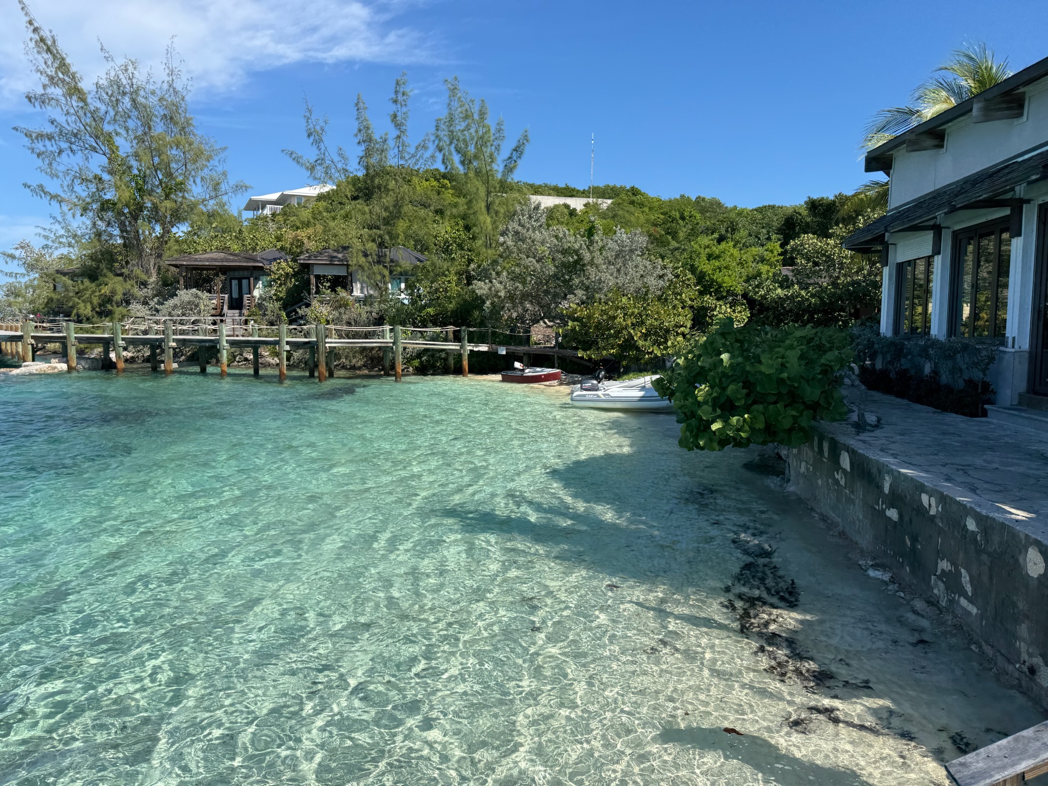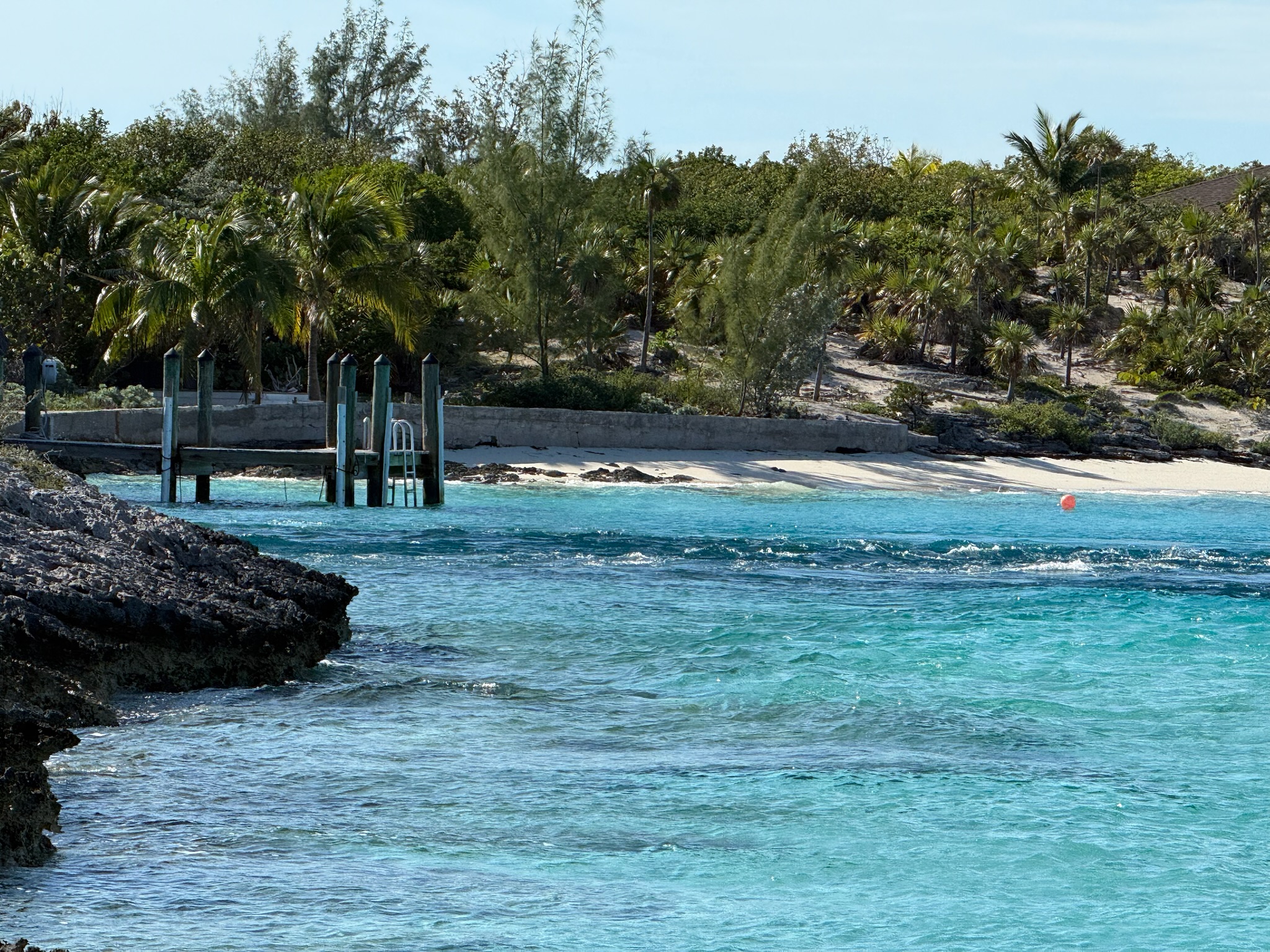 After school and morning chores, Eric and Keith went to shore to take out the trash and get lunch. Christi had an online meeting tied to her land life project, so she stayed aboard. She was sad to miss out on dry land time. Instead of taking the most direct route, where they’d be pummeled by waves coming from the south, Eric took the dingy through the pass between Big Major Cay and Fowl Cay around to the northwest side of the island, where they were protected from the waves (see map). When they arrived to the yacht club’s dinghy area, it was high tide. They were surprised to see that it was flooded.