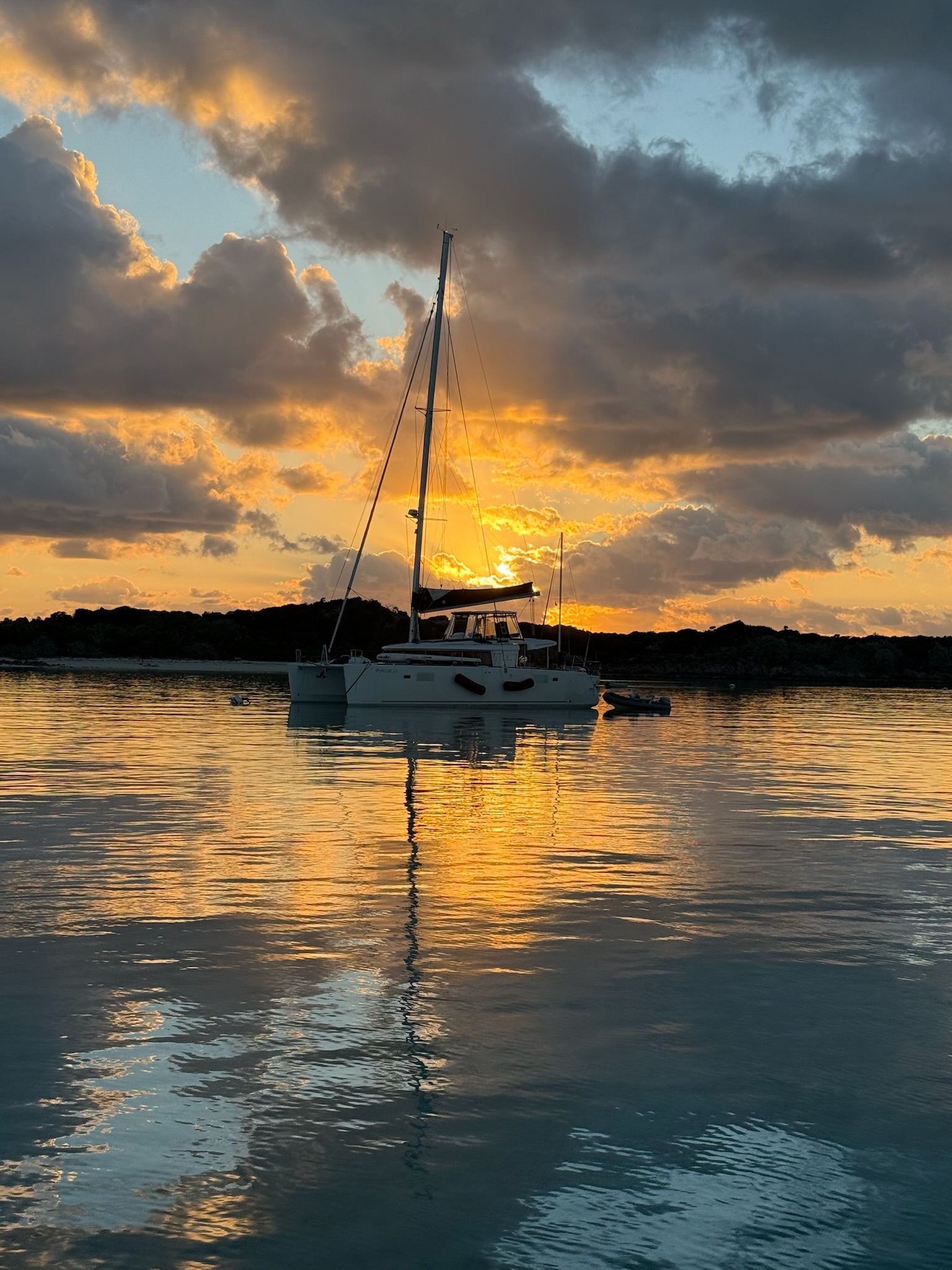 As we pulled into the channel and prepared to anchor, we saw that the rest of the group was coming back in their dinghies from a nearby snorkel spot. The ground where we anchored was rockier than we would have preferred, but we managed to set the anchor on the first try. Since the water was so calm and clear, we were able to see that the anchor really had set in sand and was not caught on a rock.