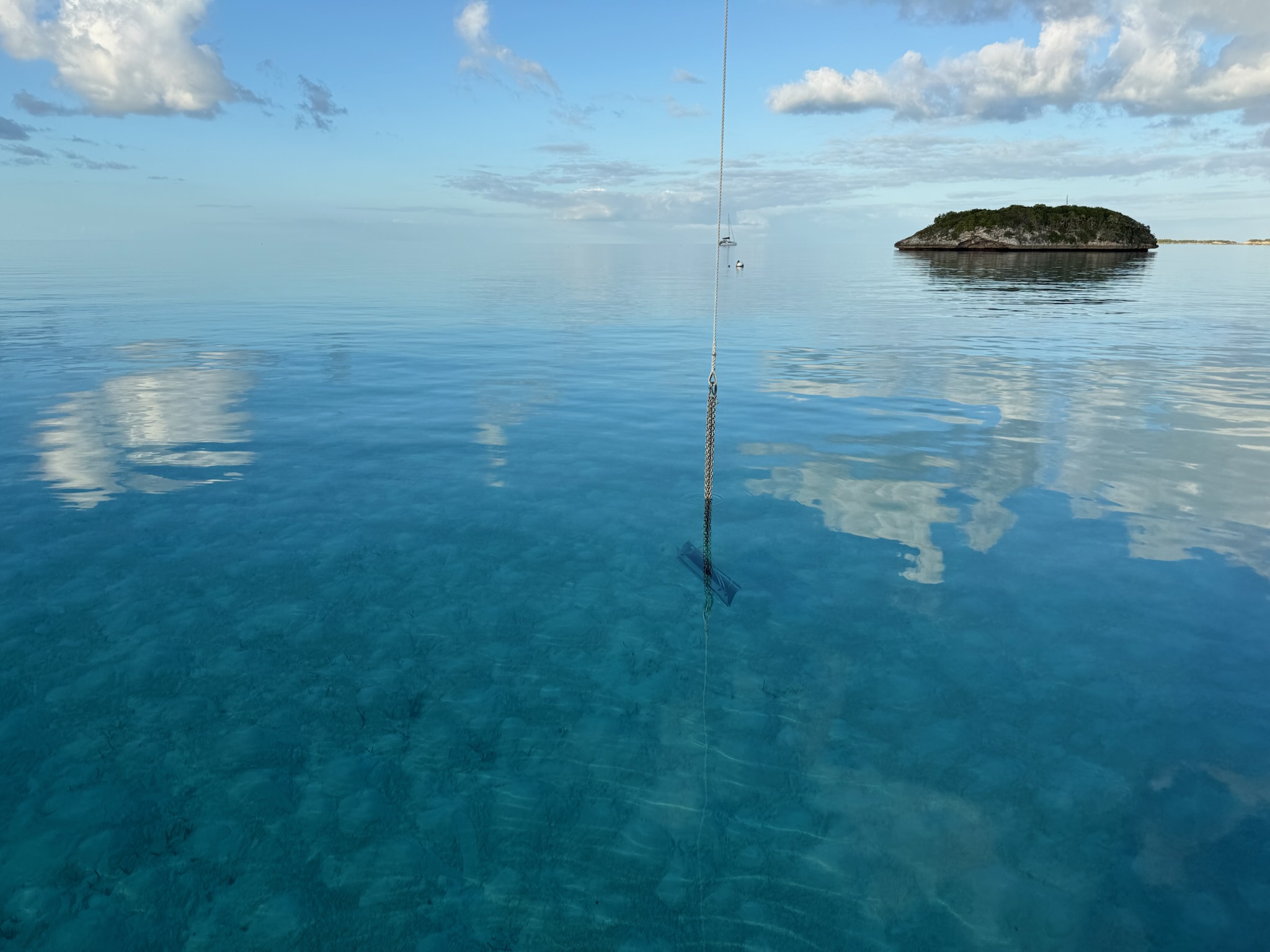We’d neglected to mention that a couple more boats had joined the flotilla between Shorud and Warderick Wells, and we were up to (we think) 10 boats. Today four of the boats left the flotilla as they had commitments in other places. One of the remaining boats suggested that we move to a relatively narrow channel surrounded by sandbars that was close by. She’s said it wasn’t a “real” anchorage as it was completely exposed, but argued that we should take advantage of having no wind to go to a place where we normally wouldn’t be able to go. She talked everyone into it.