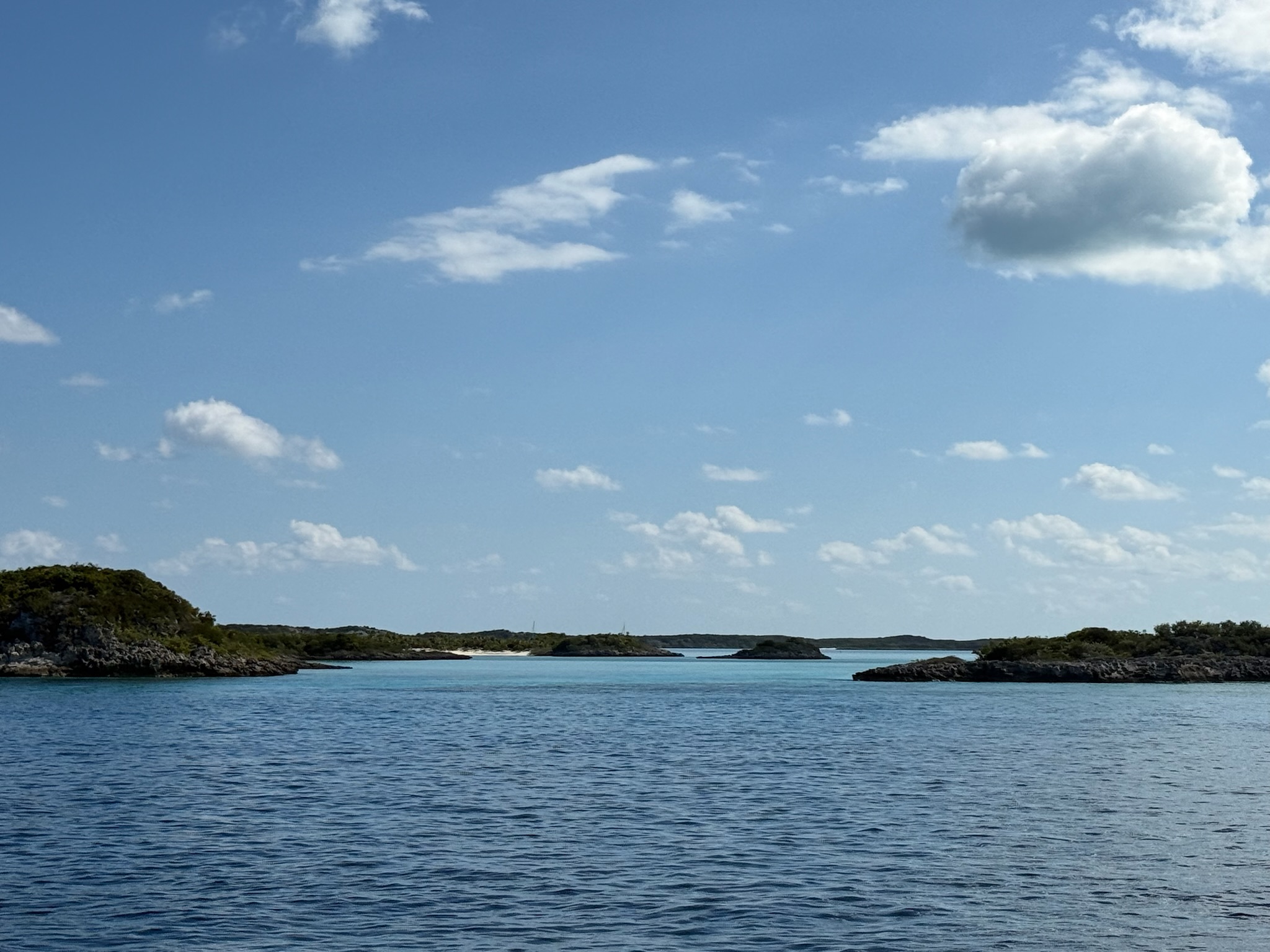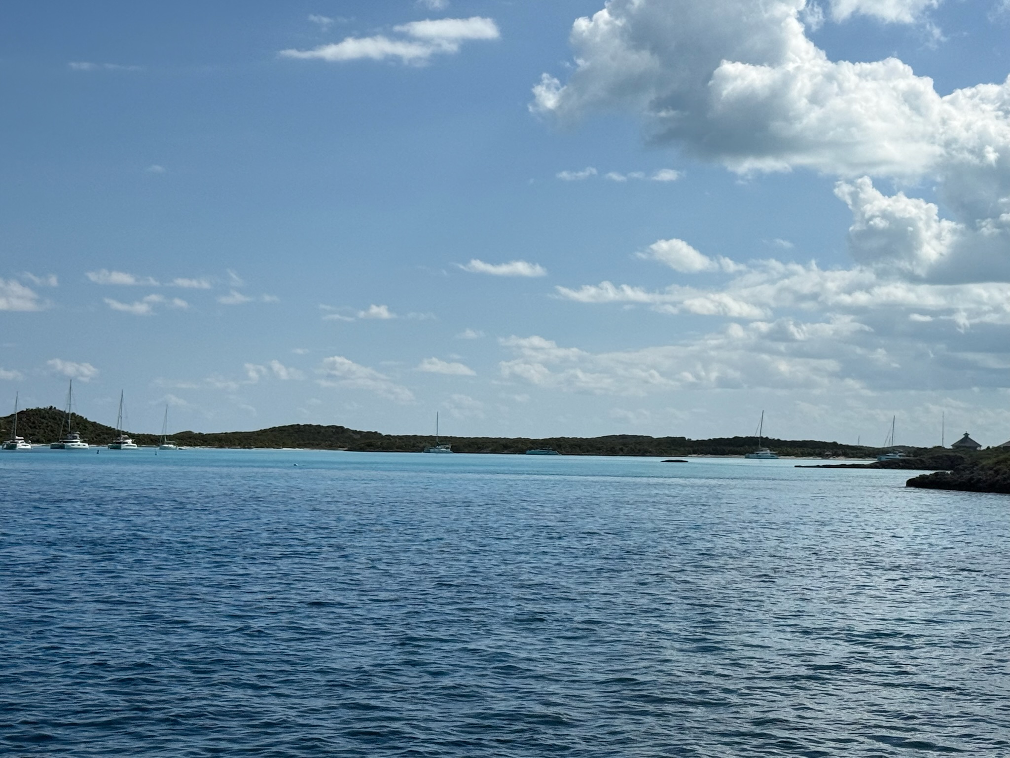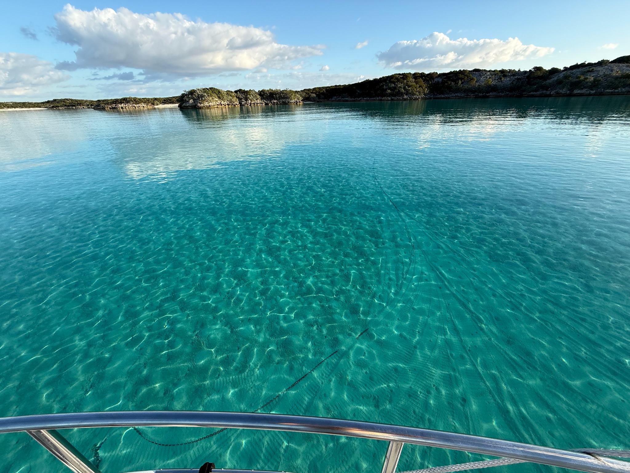 The catamarans all left right away, at 0900. Their plan was to head directly south, but that route was too shallow for us. We picked a more roundabout, but deeper path where we went north, around to the east side of Warderick Wells, and then back south to the sandbar. Even this route was shallower than we were comfortable with, so we waited to leave until around 1100, when the tide was higher.