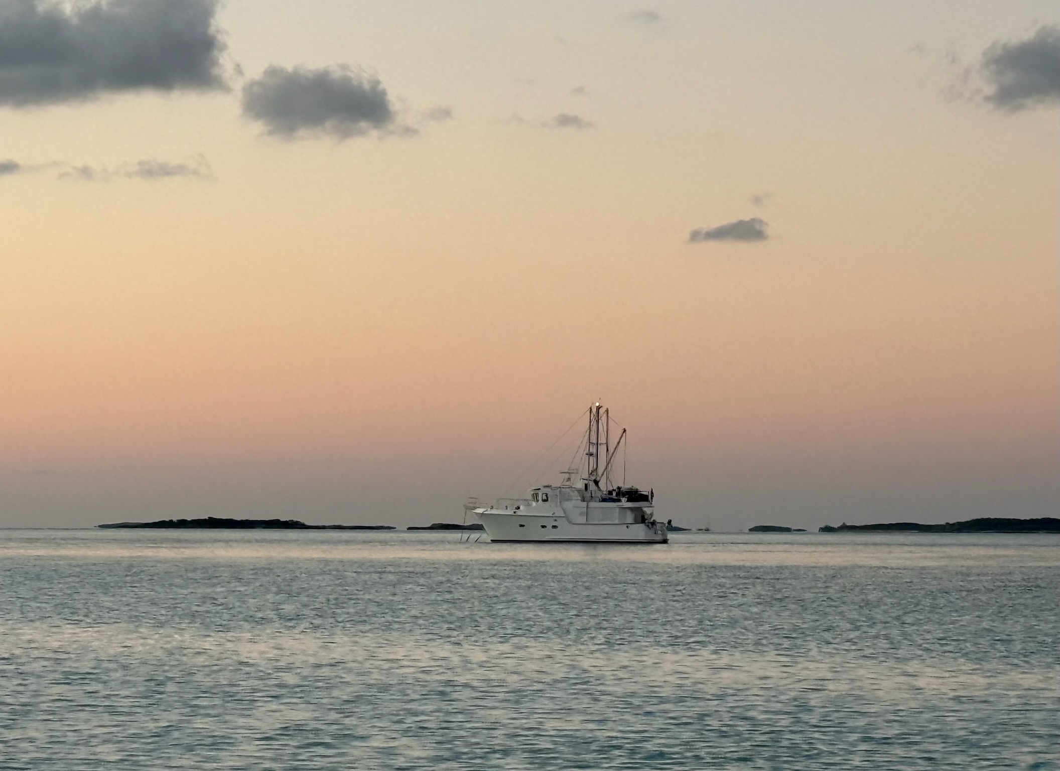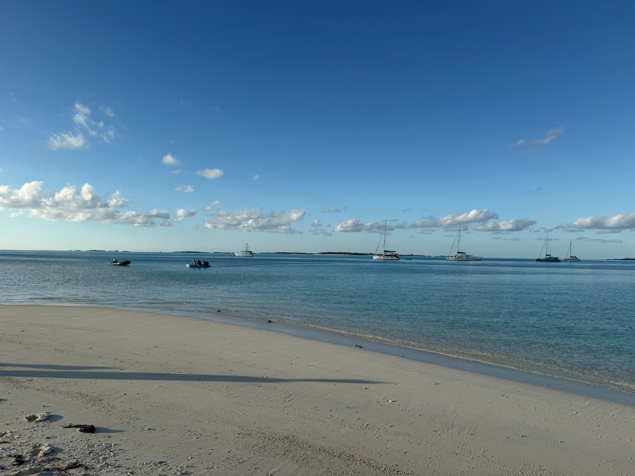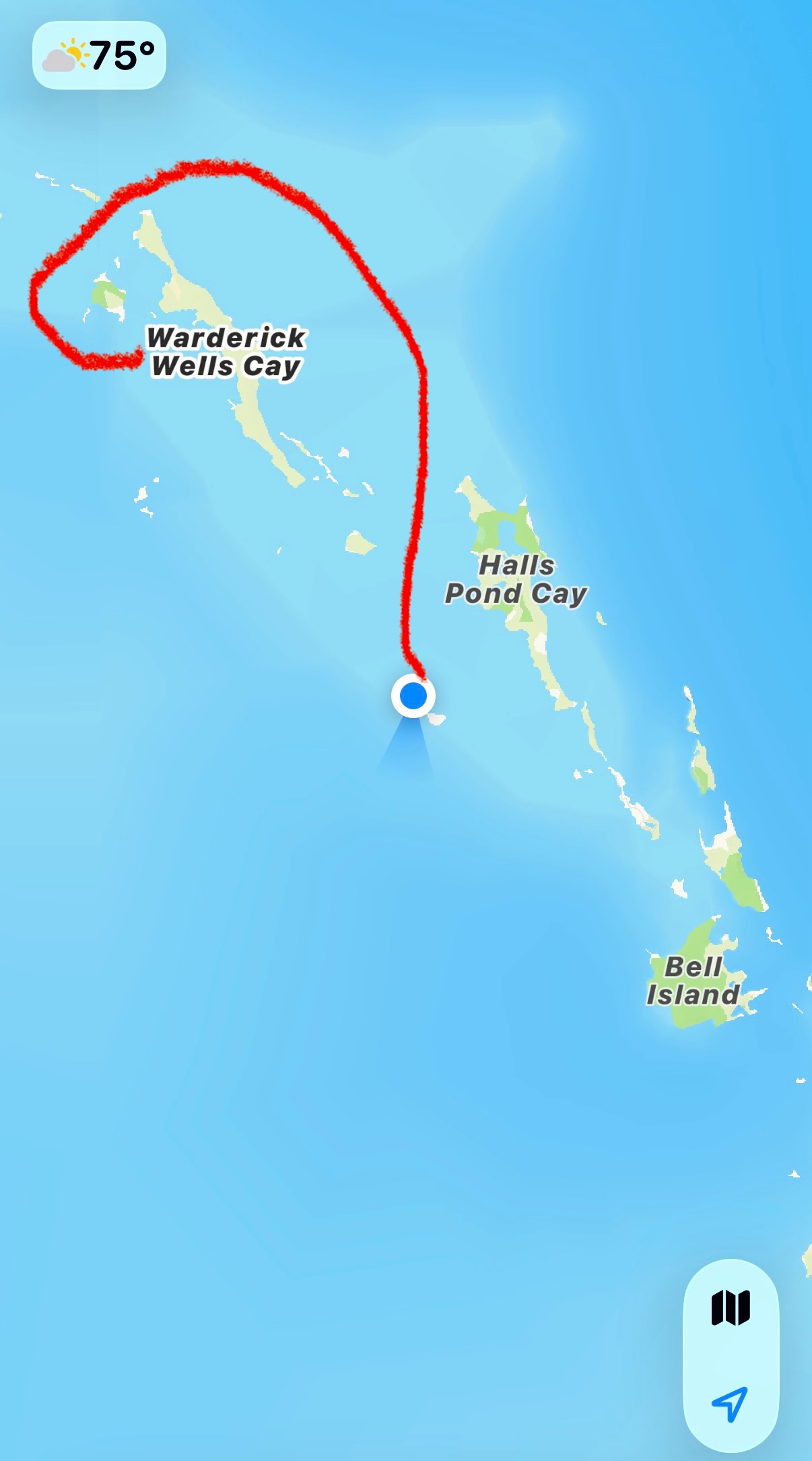 The catamarans all left right away, at 0900. Their plan was to head directly south, but that route was too shallow for us. We picked a more roundabout, but deeper path where we went north, around to the east side of Warderick Wells, and then back south to the sandbar. Even this route was shallower than we were comfortable with, so we waited to leave until around 1100, when the tide was higher.
