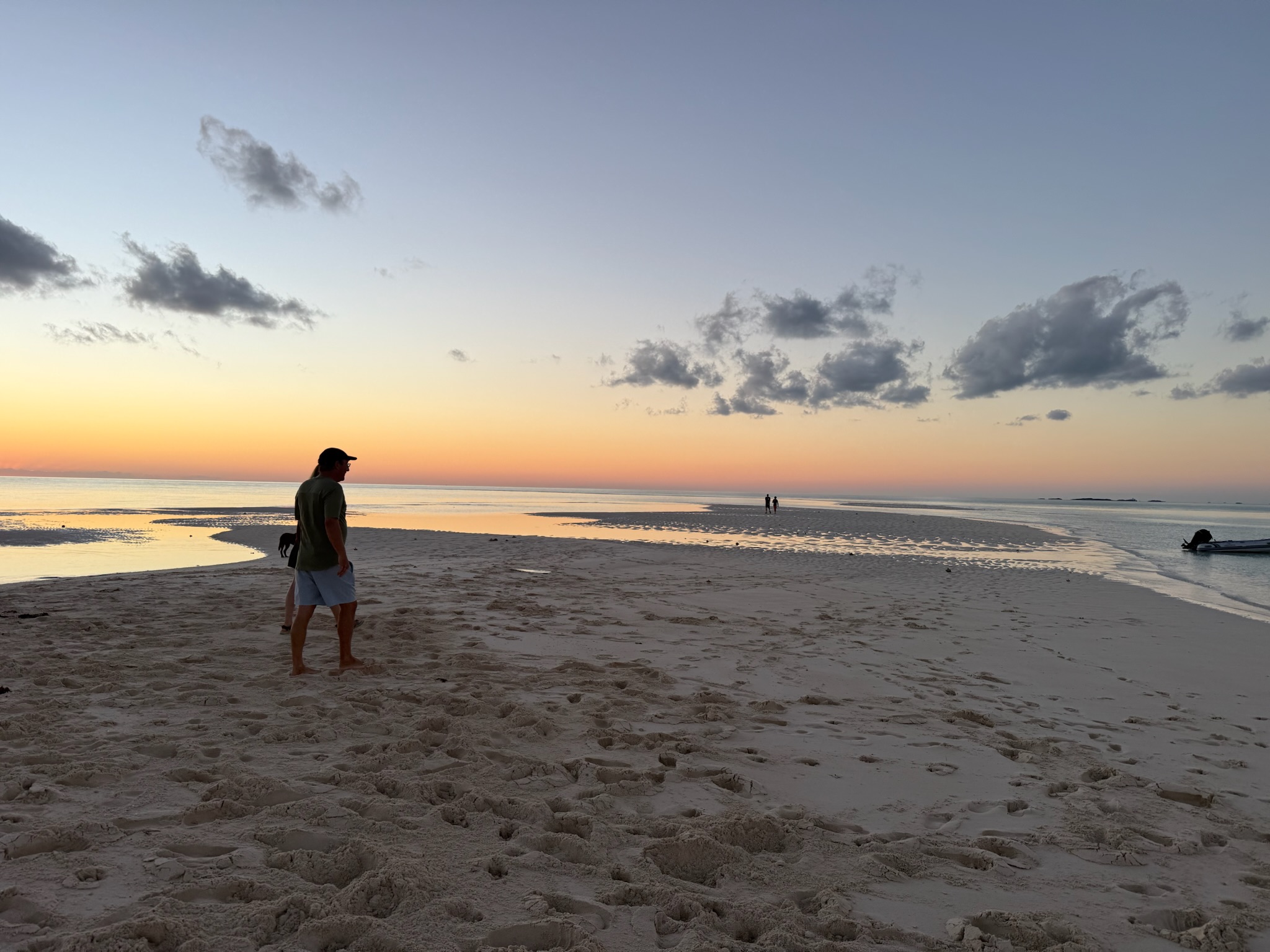 Not long after we anchored, one of the boats invited us over to play games. Eric and Keith went, but Christi stayed onboard to cook dinner. In the evening, the adults and some of the older teens went for a sunset walk along one of the sandbars. Here was the view of the boats anchored in the channel.