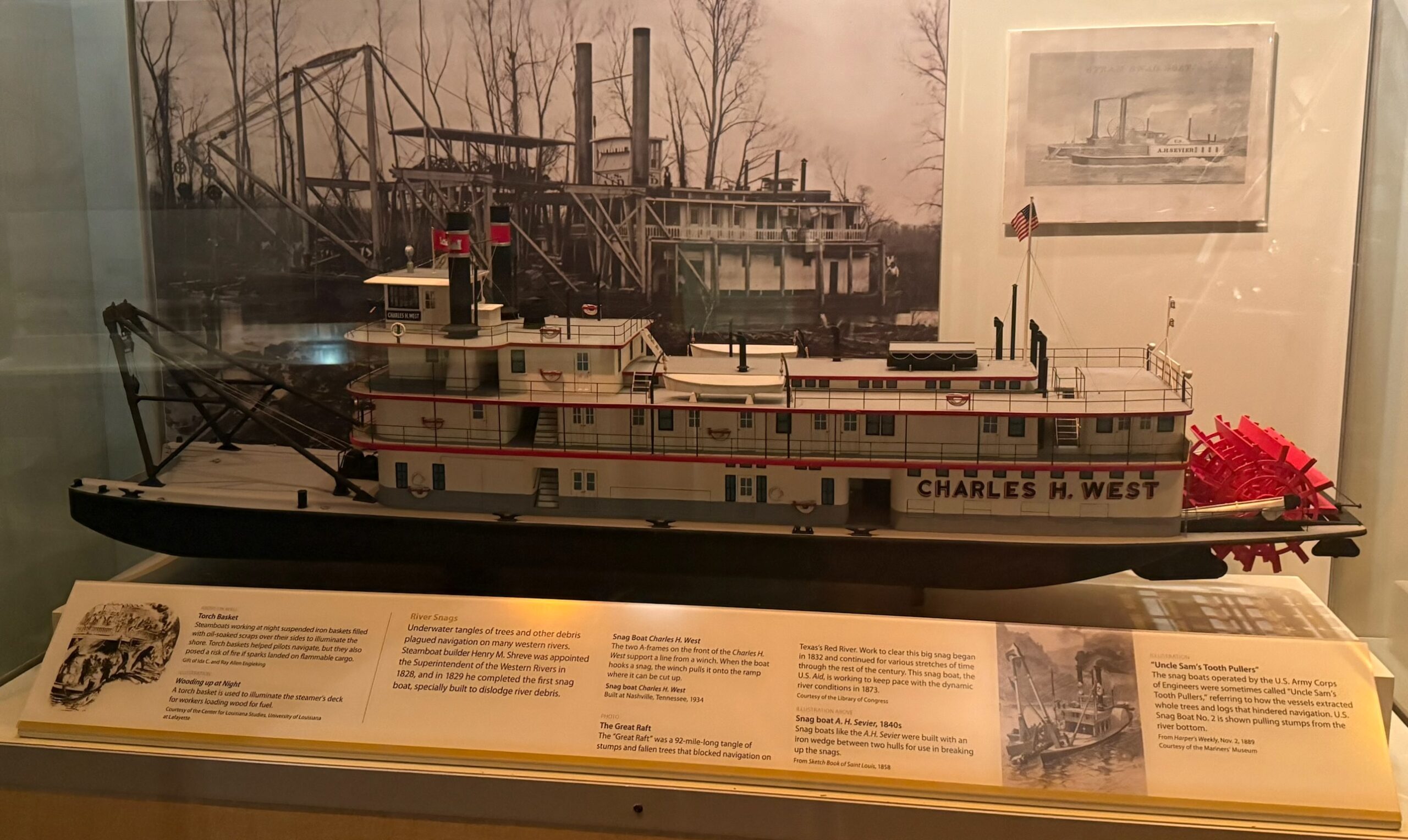 Dredgers removed excess silt and sand. Snagboats, first created in 1829, removed debris. If we understood properly, they dragged a line on the ground supported by winches. When then line caught on something, the winches would pull the line and debris that was caught on the line up.