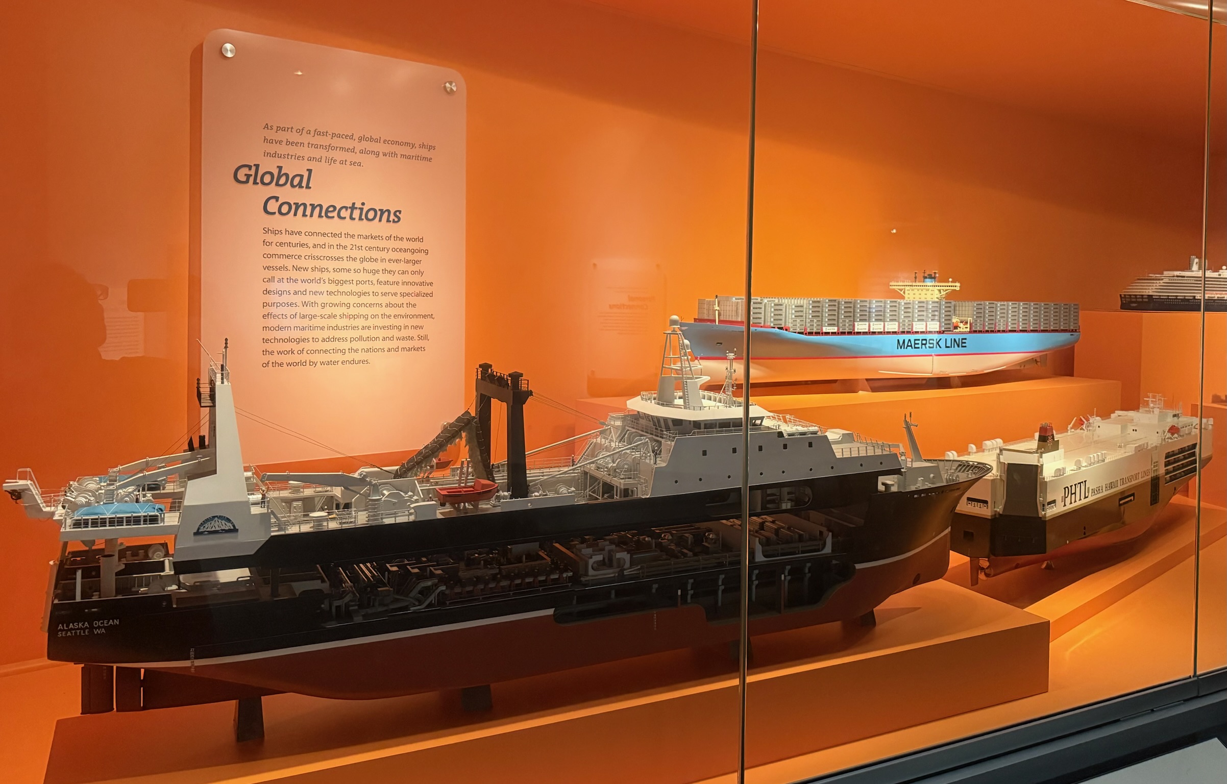 For the modern Maritime Industry, the signs talked about some of the different specializations, with a model of each type of specialty ship on display: Tankers for Liquid Natural Gas (LNG), oil tankers, cruise ships, fishing trawlers, container ships, and car carriers.