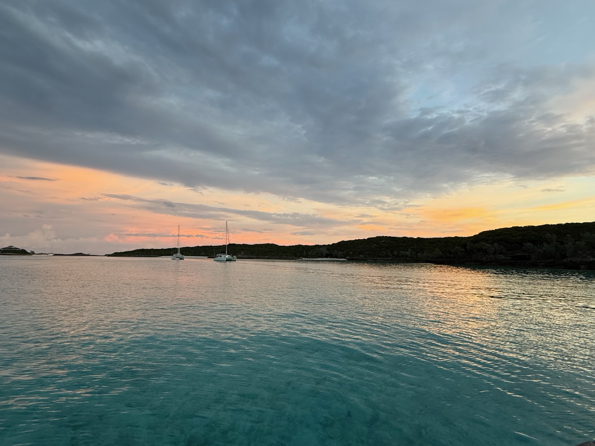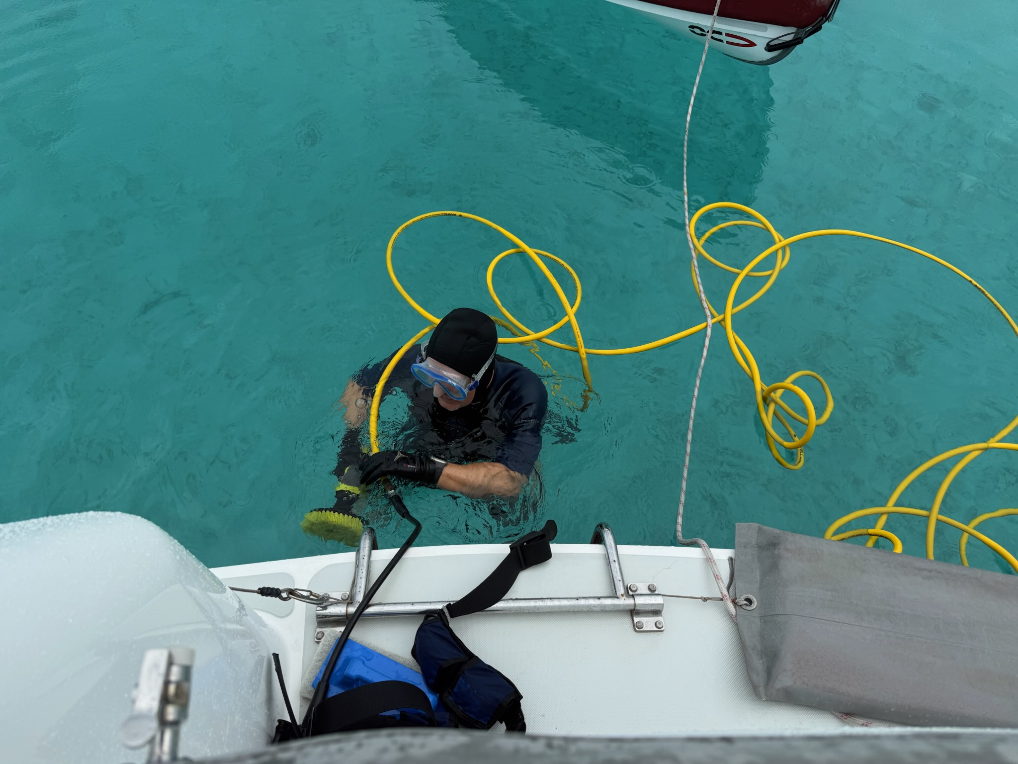 When we woke up, it was overcast and the wind screaming. Much to our relief, the charter boat moved early in the morning, so at least we didn’t have to worry about them dragging and hitting us. The anchorage was rolly and uncomfortable, so Eric put out the starboard flopper stopper, which helped dampen the motion. That said, the motion made all three of us kind of grouchy. Even though it was rolly where we were, it was much worse on the north side, so we were glad we moved yesterday instead of waiting until today. Rain was in the forecast.